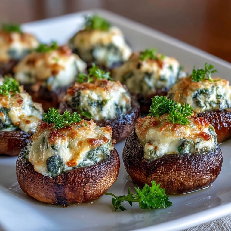 The secret to these stuffed mushrooms lies in a simple but important step: cooking the chopped mushroom stems and fresh spinach in a skillet before mixing them into the cream cheese filling. This drives out excess moisture, ensuring your filling stays rich and creamy rather than watery once air-fried. The result is a melt-in-your-mouth interior perfectly contrasted by a lightly crisped, Parmesan-dusted top. Finished with a sprinkle of fresh parsley and served warm, these little bites are as beautiful as they are delicious.