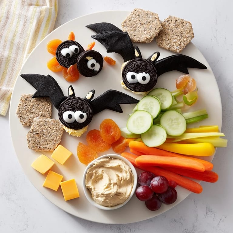 Save A spooky and playful snack board featuring flying bat-shaped treats, perfect for Halloween gatherings. This festive platter combines sweet and savory bites for all ages.