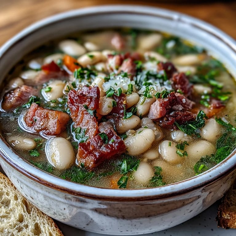 Save The magic of this soup lies in its simplicity. Great Northern beans are prized for their mild, nutty flavor and their ability to absorb the savory depth of ham and broth over long, slow cooking. As the hours pass, the beans soften to a velvety tenderness, the vegetables melt into the broth, and the ham releases its smoky, salty essence into every spoonful. A pair of bay leaves and a touch of dried thyme weave a subtle herbal thread throughout, tying all the flavors together into something far greater than the sum of its parts. This is the kind of soup that tastes even better the next day.