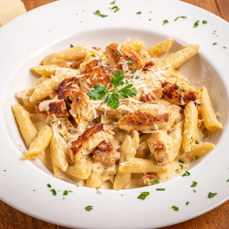 Save A creamy, flavorful pasta dish featuring tender chicken, crispy bacon, and a homemade ranch-infused sauce tossed with penne. Perfect for a comforting weeknight dinner.