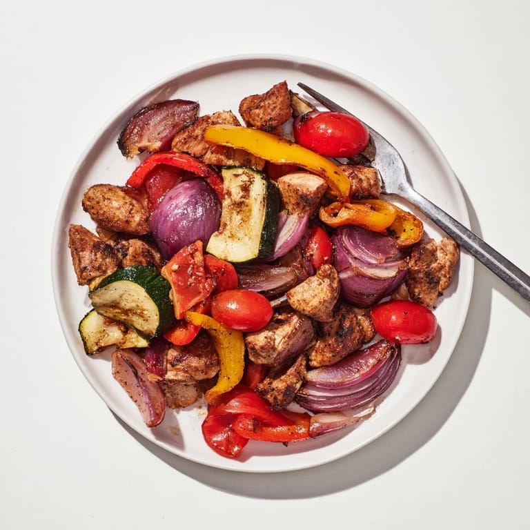 Red onion, bell peppers, zucchini, and cherry tomatoes add sweetness and texture, roasting well alongside the chicken.
