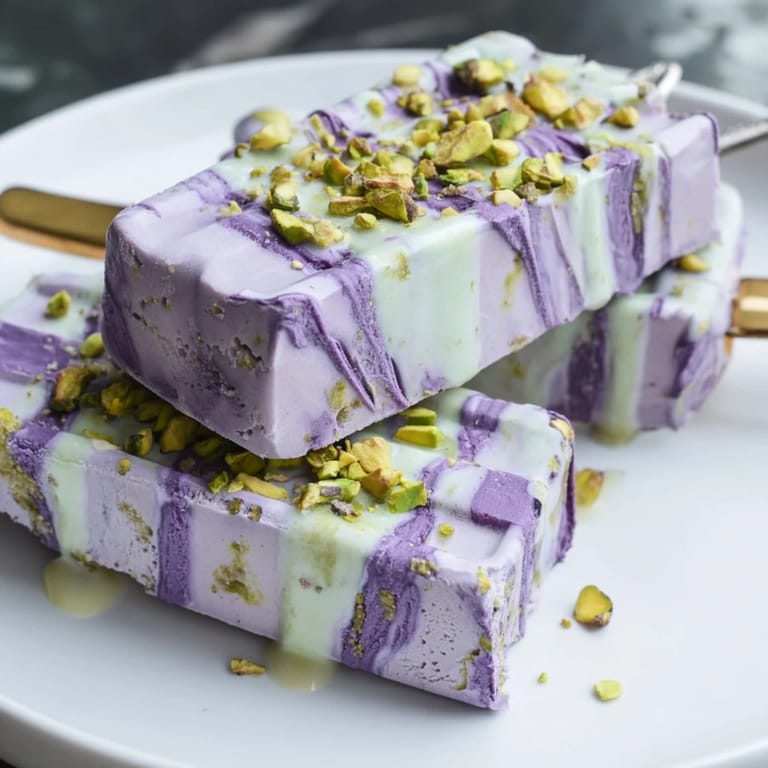 Save Creamy, vibrant ice cream bars featuring sweet ube and nutty pistachio, layered for a delightful contrast in flavor and color. Perfect for a refreshing summer dessert or an impressive treat for gatherings.