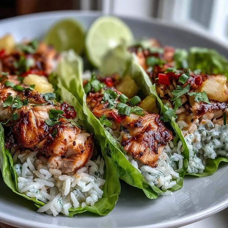 Save Imagine a meal that transports you to a tropical paradise with every bite—crisp lettuce cradling tender, juicy chicken kissed with the sweetness of fresh pineapple, all paired with fluffy jasmine rice infused with ginger and sesame. These Pineapple Chicken and Rice Lettuce Wraps are a celebration of bright, bold flavors and refreshing textures. Light yet satisfying, they're perfect for a quick weeknight dinner or a casual gathering with friends. Each wrap is a handheld adventure, balancing savory, sweet, and tangy notes that will leave you craving more.