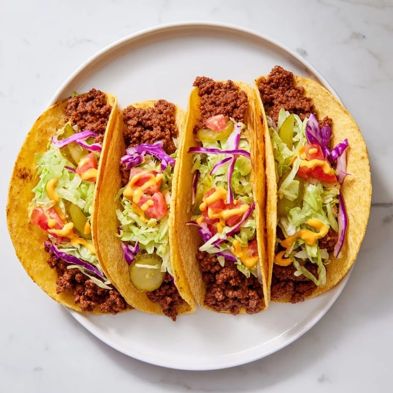 - Fill each taco with shredded lettuce, tomato, pickles, and red onion. Drizzle with burger sauce.