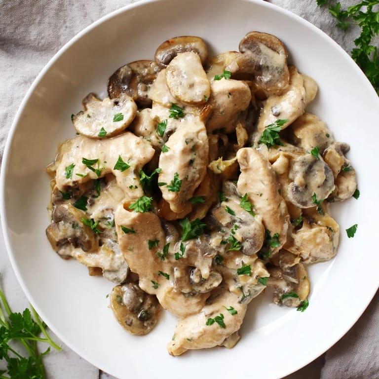 Tender chicken in a rich creamy mushroom sauce, ideal over noodles or rice.