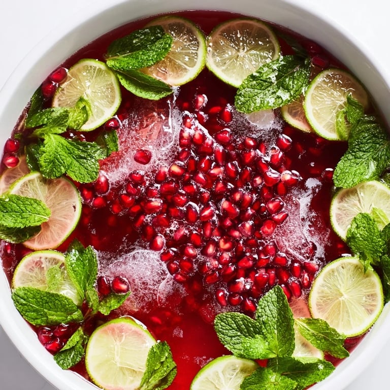Save A festive, vibrant holiday drink featuring sparkling pomegranate, fresh mint, and citrus, perfect for gatherings.