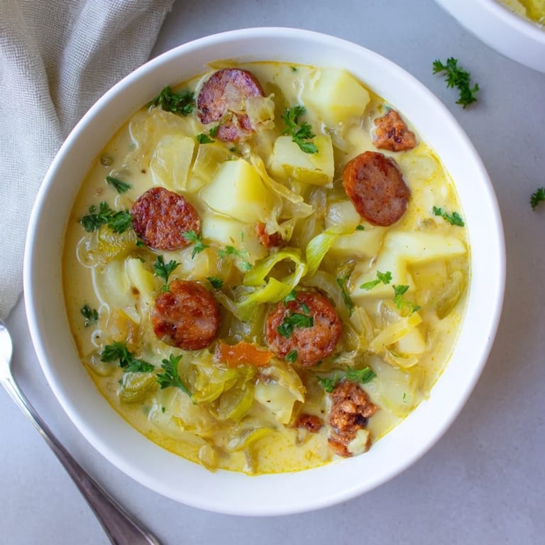 Save A hearty and flavorful soup combining creamy potatoes, tender leeks, and spicy chorizo for a comforting meal perfect for cool days.
