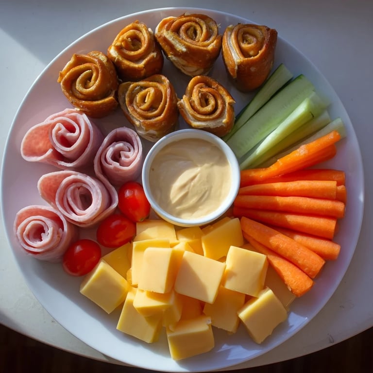 - 1. Arrange mini pretzels, cheese cubes, and rolled turkey slices on a large platter or wooden board.