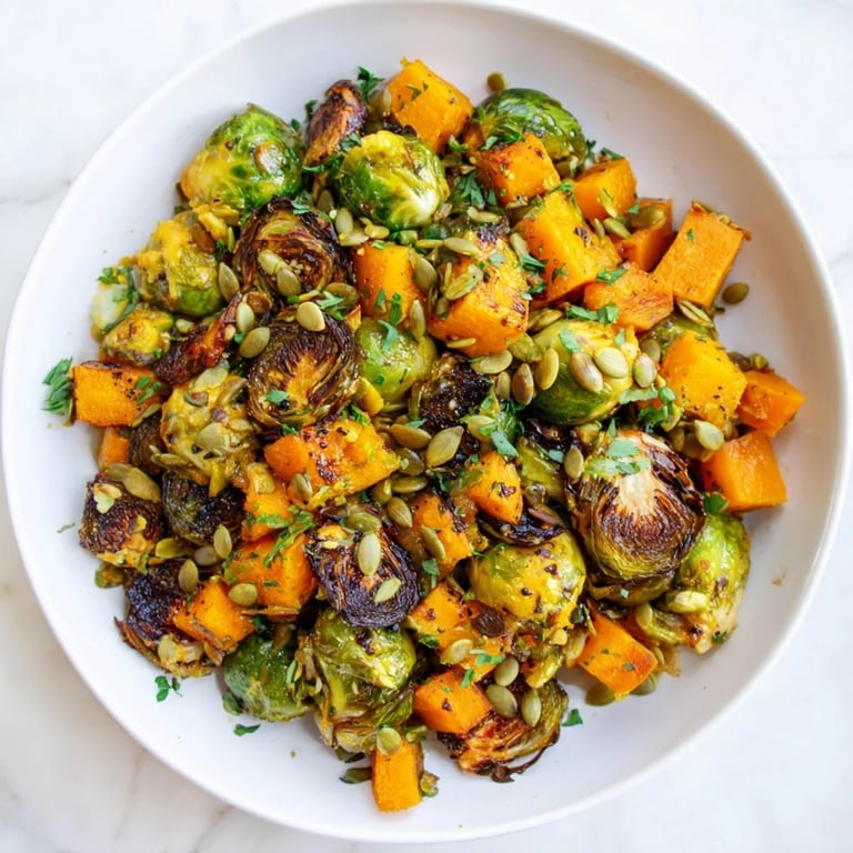 Savory serving of Roasted Brussels Sprouts & Butternut Squash, garnished with seeds and parsley, ready to eat. Save